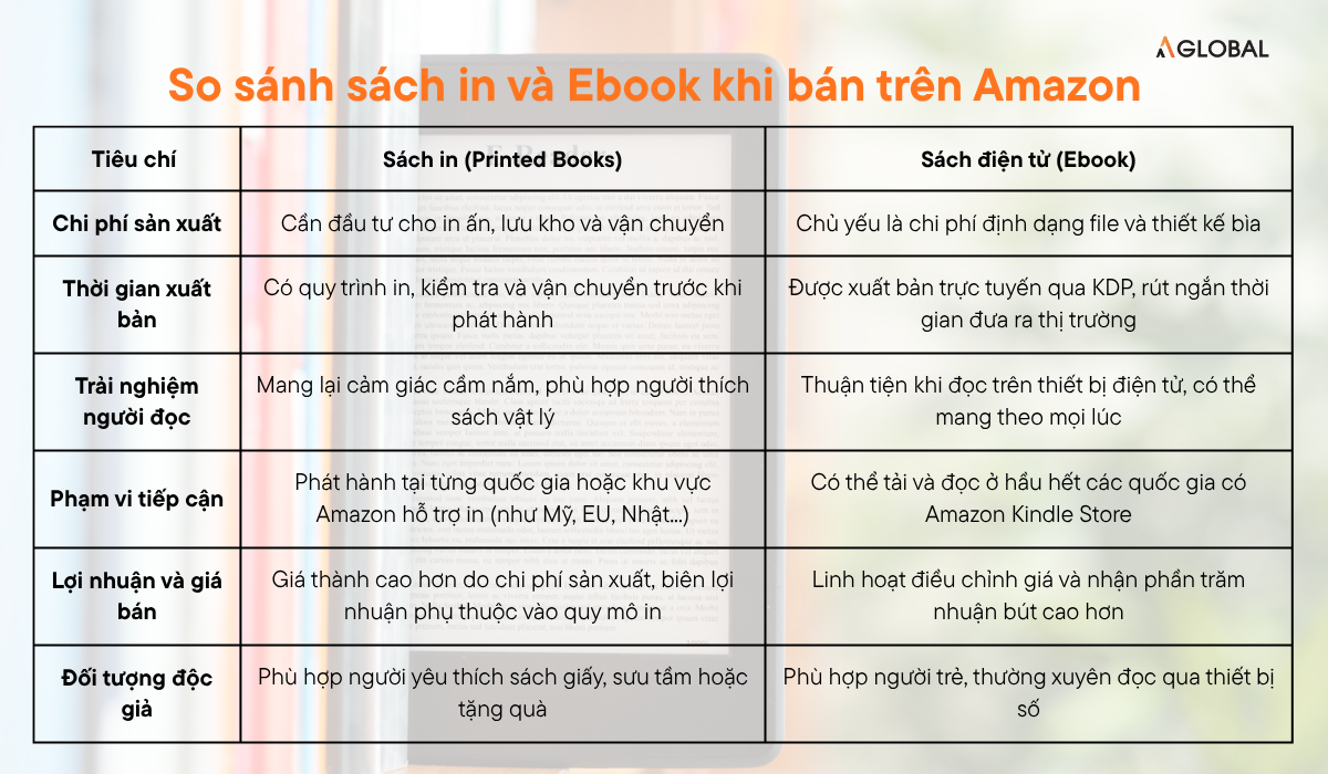 Khi bắt đầu kinh doanh trên Amazon Book, người bán thường băn khoăn nên chọn bán sách in (Printed Books) hay sách điện tử (Ebook). Bởi mỗi hình thức đều có ưu và nhược điểm riêng, tùy vào mục tiêu, nguồn lực và đối tượng độc giả mà bạn hướng tới. Bảng so sánh dưới đây sẽ giúp bạn hình dung rõ hơn: