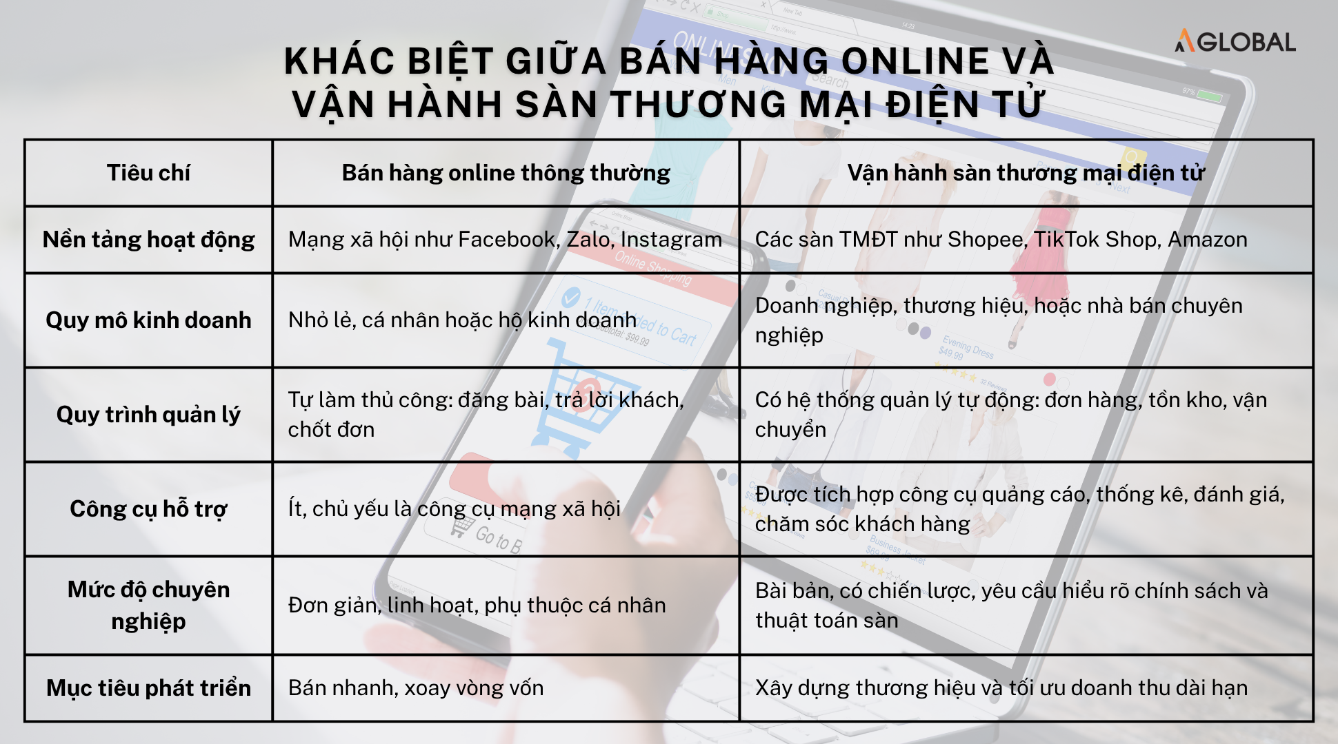 Sự khác biệt giữa hai hình thức này nằm ở quy mô, công cụ quản lý và mức độ chuyên nghiệp trong vận hành. Nếu như bán hàng online thông thường chủ yếu dựa vào nền tảng mạng xã hội và cá nhân tự quản lý, thì vận hành sàn thương mại điện tử đòi hỏi quy trình bài bản cùng hệ thống hỗ trợ tự động hóa.