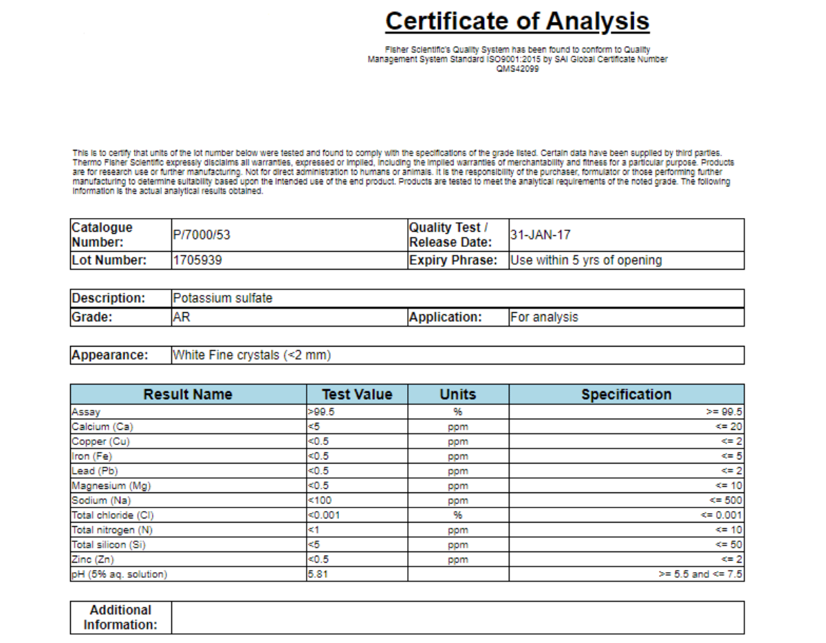 Depending on the product, a COA may include additional physicochemical indicators such as: pH of solution, chloride, nitrogen or silicon content, moisture, ion concentration, or stability index. These parameters help evaluate the chemical characteristics and storage ability of the product.